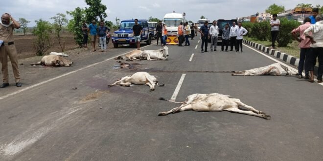 सावनेर ः तालुक्यातील केळवद पोलिस स्टेशन हद्दीतील नांदागोमुख पासून तीन किलोमीटर अंतरावरील सतरापूर या गावातून गाव गोहना मधील गुरेढोरे गुराखी चारायला नेत असताना सतरापूर गावाला लागूनच असलेला सावनेर बैतूल या राज्य महामार्गावर आज सकाळी 11 वाजता बैतूल कडून नागपूरला जाणारा आयशर क्रमांक आर जे 39 जीए 3189 या वाहनाने मागेपुढे न पाहता जोरदार धडक दिली त्या धडकेमध्ये नऊ जनावरे जागीच मृत्युमुखी पडले तर पाच म्हशी व गाई जागेवरच गंभीर जखमी झाले*
