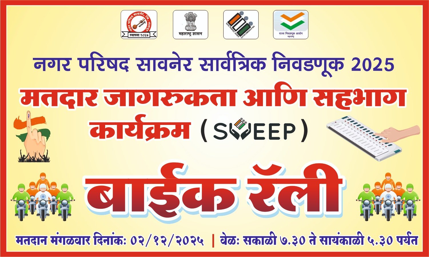 मतदार जागरूकता आणि सहभाग कार्यक्रम (SVEEP) अंतर्गत. निवडणुकी मध्ये मतदानाची टक्केवारी वाढवण्यासाठी माननीय निवडणूक निर्णय अधिकारी अक्षय पोयाम , सहाय्यक निवडणूक निर्णय अधिकारी अर्शिया जुही यांच्या मार्गदर्शनाखाली,रवींद्र लोही SVEEP नोडल अधिकारी,संदेश खंडागळे, बालाजी बेंबडे, रोशन धोटे , विनय वाघमारे , शिवदास ठाकरे,मयूर चाफेकर या कर्मचाऱ्यांच्या साह्याने माननीय मुख्याधिकारी अर्शिया जुही यांच्या नेतृत्वाखाली नगरपरिषद सावनेर येथुन मतदान जनजागृती करण्यासाठी भव्य बाईक रॅली चे आयोजन करण्यात आले .