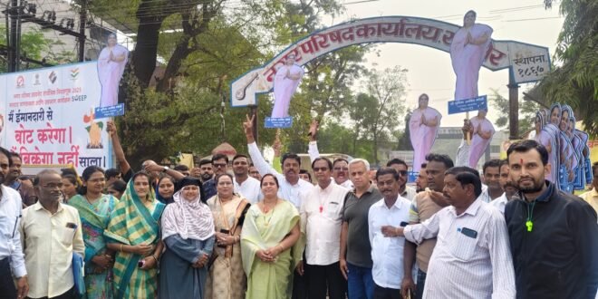 *चुनाव चिन्ह वाटप प्रक्रिया संपन्न होते ही नगर विकास आघाडीके प्रणेता अँड्. अरविंद लोधीके नेतृत्व मे ढोल ताशोके साथ रैली का आयोजन कर गांधी चौक स्थीत महात्मा गांधी के प्रतिमा को माल्यार्पण तथा पुरातन हनुमान मंदिर मे मत्था टेककर आशिर्वाद प्राप्त कीया.*